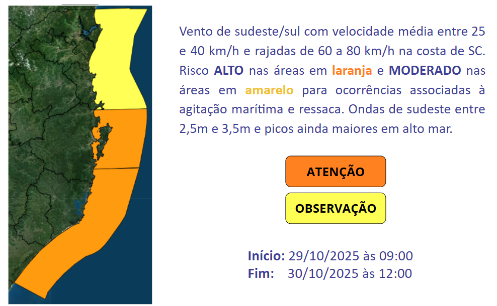 Ao longo desta quarta (29) e em boa parte da quinta-feira (30), o mar permanece agitado em todo o litoral catarinense, com ondas de direção sudeste, entre 2,5 e 3,5m e picos maiores em alto mar. As ondas atingem seu pico entre a tarde e noite desta quarta e começam a diminuir gradativamente entre a madrugada e manhã de quinta-feira. O risco é moderado a alto para ocorrências associadas à agitação marítima e ressaca.