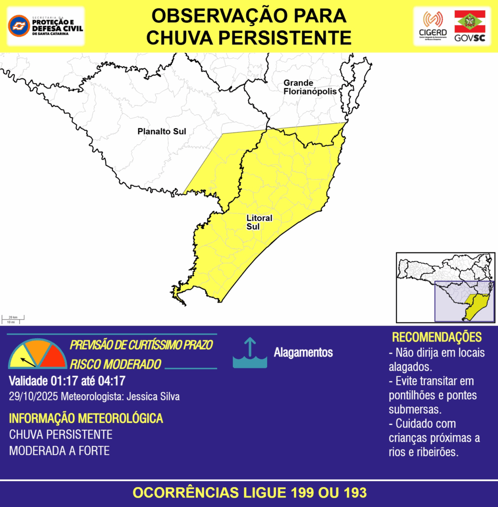 OBSERVAÇÃO – 29/10 01:17 – CHUVA PERSISTENTE de intensidade moderada a forte com ALAGAMENTOS pontuais para as regiões do Planalto Sul, Litoral Sul e Grande Florianópolis nas próximas 3 horas. Ocorrências ligue 199 ou 193.