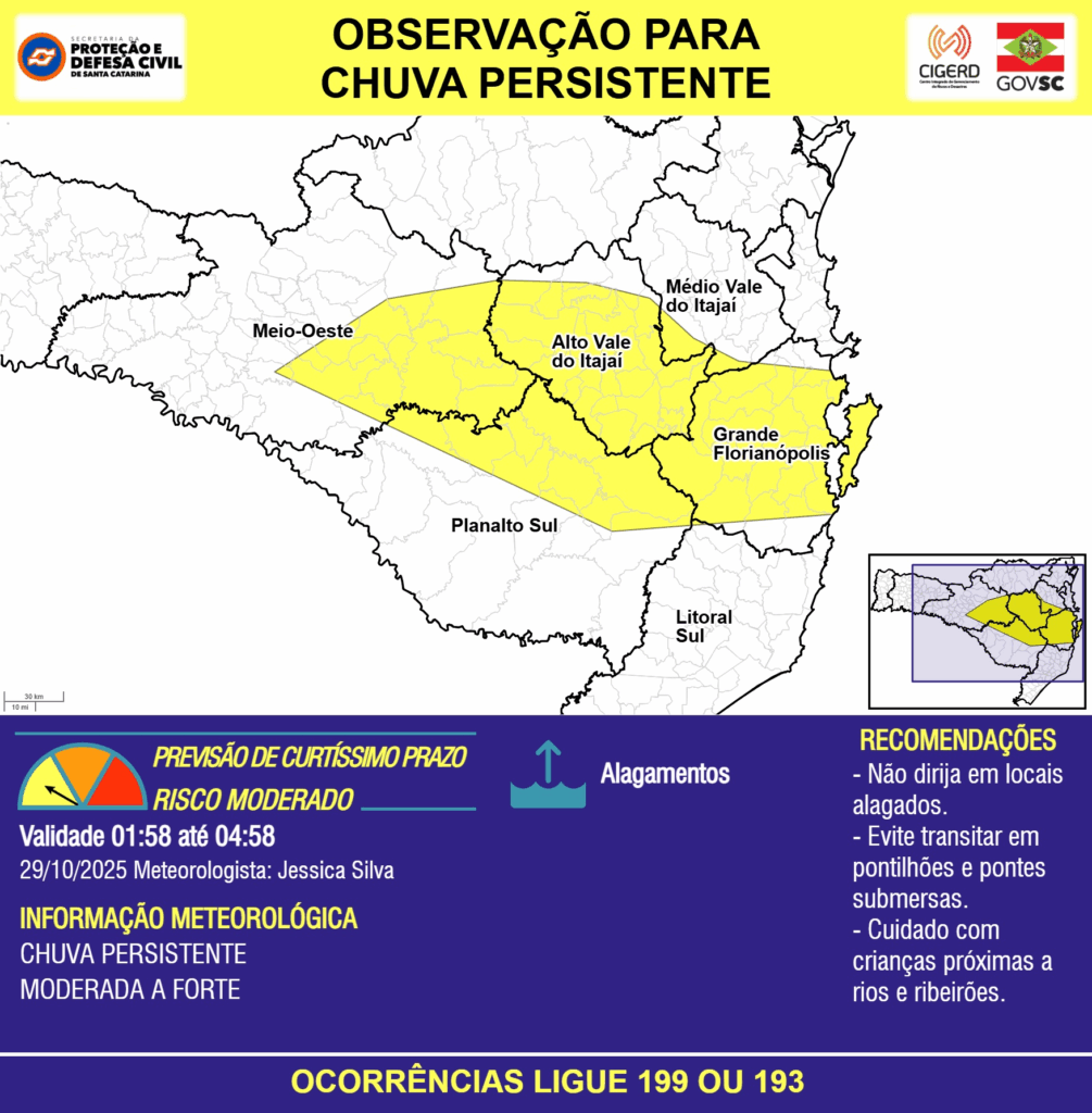 OBSERVAÇÃO – 29/10 01:58 – CHUVA PERSISTENTE de intensidade moderada a forte com ALAGAMENTOS pontuais para as regiões do Meio-Oeste, Planalto Sul, Litoral Sul, Grande Florianópolis, Médio e Alto Vale do Itajaí nas próximas 3 horas. Ocorrências ligue 199 ou 193.