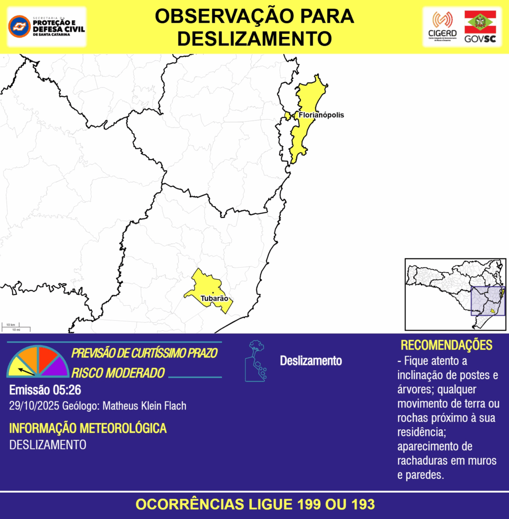 OBSERVAÇÃO – 29/10 05:26 – DESLIZAMENTO para os municípios de Florianópolis e Tubarão. Ocorrências ligue 199 ou 193.