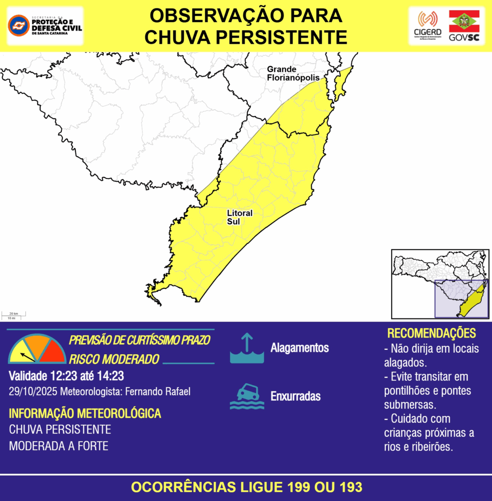 OBSERVAÇÃO – 29/10 12:23 – CHUVA PERSISTENTE de intensidade moderada a forte com ALAGAMENTOS pontuais e risco de ENXURRADAS para as regiões do Litoral Sul e Grande Florianópolis nas próximas 2 horas. Ocorrências ligue 199 ou 193.