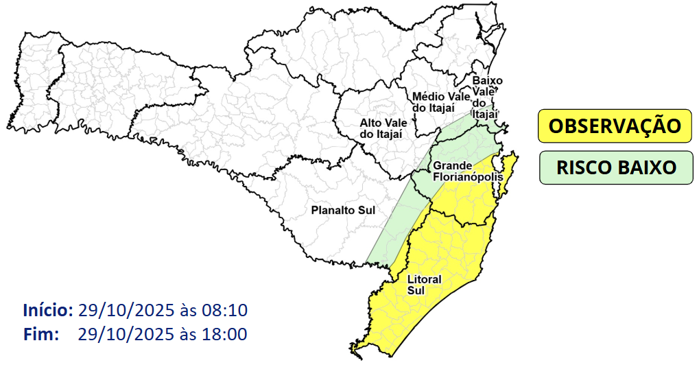 Entre a manhã e tarde desta quarta-feira (29), a influência de uma área de baixa pressão posicionada sobre o Oceano Atlântico, que gera uma pista de ventos de direção sudeste e contribui para o transporte de umidade do mar em direção ao continente, segue favorecendo a ocorrência de chuva persistente entre a Grande Florianópolis e o Litoral Sul. O risco permanece entre baixo a moderado para alagamentos e enxurradas pontuais nessas áreas.