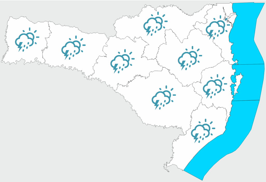 No sábado (01), o sol volta a aparecer em todo o estado e as temperaturas sobem à tarde. O calor e a disponibilidade de umidade, favorecem o desenvolvimento de temporais isolados com raios e rajadas de vento, especialmente no Grande Oeste e Planalto Norte. O risco é baixo para ocorrências associadas. Nas demais regiões, há condições para pancadas de chuva isoladas, com trovoadas. No amanhecer, as temperaturas mínimas variam entre 12 e 17°C. À tarde, as temperaturas máximas ficam entre 25 e 27°C no Oeste, Litoral Sul e nas áreas de divisa com o Rio Grande do Sul e variam entre 21 e 25°C nas demais regiões.