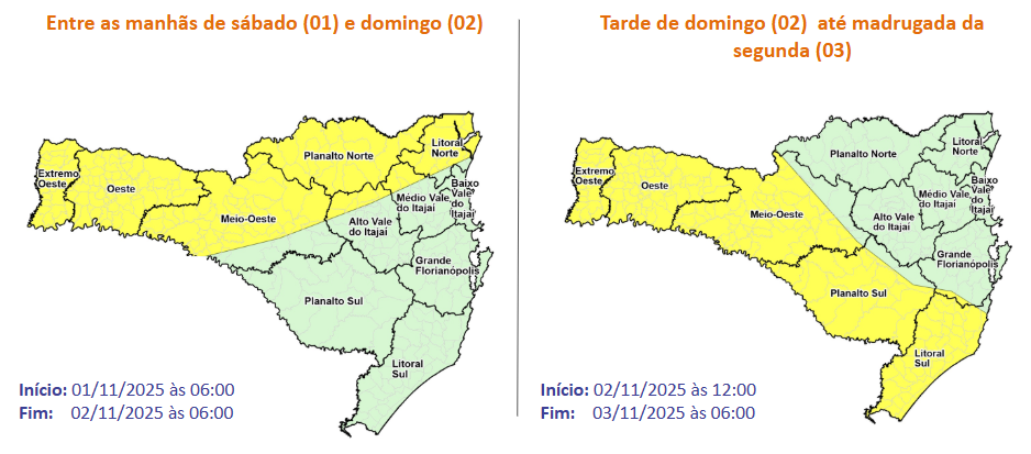 A partir da tarde do sábado (01) os temporais avançam pelas áreas de divisa com o Paraná e se concentram entre o Grande Oeste e o norte catarinense até a manhã do domingo (02/11). Já entre a tarde do domingo (02/11) e a madrugada da segunda-feira (03/11) a chuva avança em direção ao sul do estado, com condição para temporais isolados nas áreas próximas à divisa com o Rio Grande do Sul.
