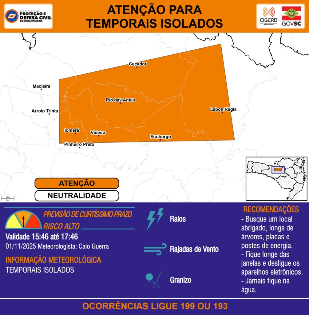ATENÇÃO – 01/11 15:46 – TEMPORAIS ISOLADOS com RAIOS, RAJADAS DE VENTO e GRANIZO para os municípios de Arroio Trinta, Calmon, Caçador, Fraiburgo, Iomerê, Lebon Régis, Macieira, Pinheiro Preto, Rio das Antas e Videira nas próximas 2 horas. Ocorrências ligue 199 ou 193.