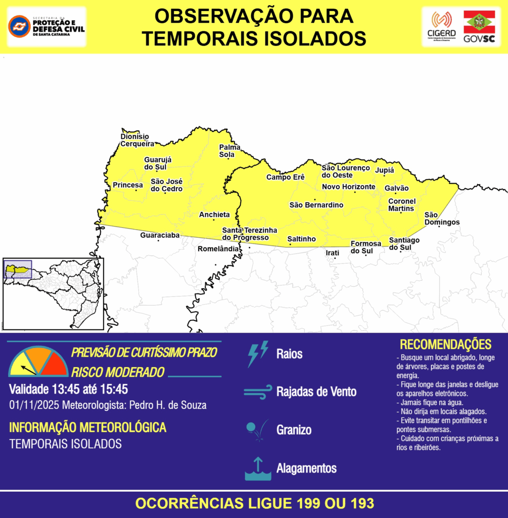 OBSERVAÇÃO – 01/11 13:45 – TEMPORAIS ISOLADOS com RAIOS, RAJADAS DE VENTO, GRANIZO e ALAGAMENTOS pontuais para os municípios de Anchieta, Campo Erê, Coronel Martins, Dionísio Cerqueira, Formosa do Sul, Galvão, Guaraciaba, Guarujá do Sul, Irati, Jupiá, Novo Horizonte, Palma Sola, Princesa, Romelândia, Saltinho, Santa Terezinha do Progresso, Santiago do Sul, São Bernardino, São Domingos, São José do Cedro e São Lourenço do Oeste nas próximas 2 horas. Ocorrências ligue 199 ou 193.