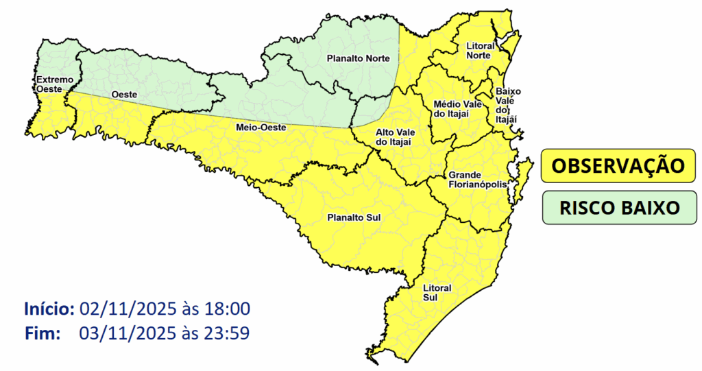 Entre o final da tarde e a noite do domingo (02/11) os temporais começam mais isolados e de forma passageira em áreas do norte catarinense. Já entre a madrugada e manhã da segunda-feira (03/11) um novo ciclo de temporais começa entre o Oeste e os Planaltos, nas áreas de divisa com o RS, avançando para o Vale do Itajaí e o Litoral no decorrer do dia.