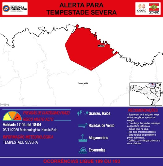 ALERTA – 03/11 17:04 – TEMPESTADE SEVERA com RAJADAS DE VENTO, ALAGAMENTOS, GRANIZO, RAIOS e risco de ENXURRADAS para os municípios de Itaiópolis e Mafra na próxima hora. Ocorrências ligue 199 ou 193.