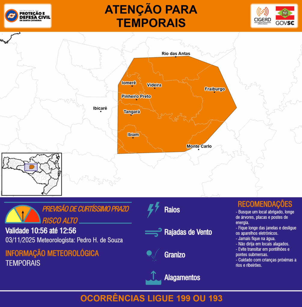 ATENÇÃO – 03/11 10:56 – TEMPORAIS com RAIOS, RAJADAS DE VENTO, GRANIZO e ALAGAMENTOS para os municípios de Fraiburgo, Ibiam, Ibicaré, Iomerê, Monte Carlo, Pinheiro Preto, Rio das Antas, Tangará e Videira nas próximas 2 horas. Ocorrências ligue 199 ou 193.