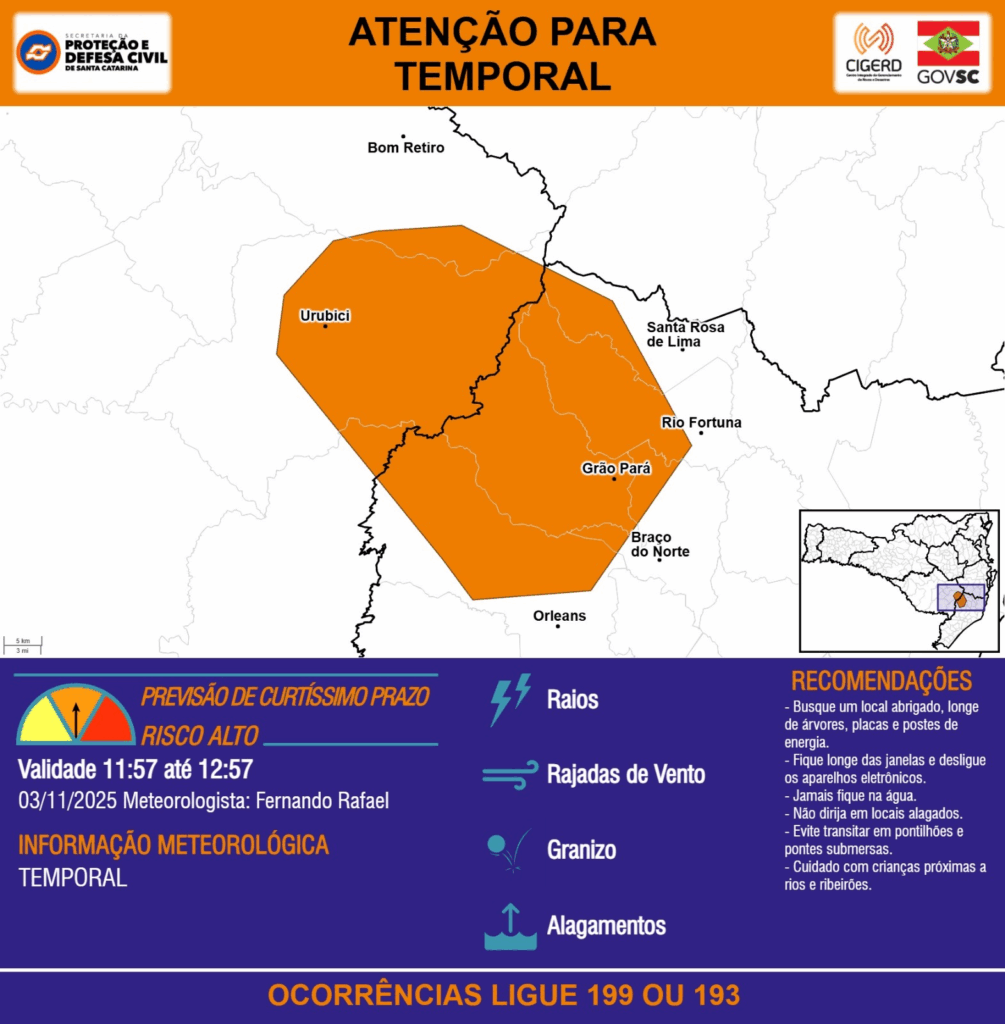 ATENÇÃO – 03/11 11:57 – TEMPORAL com RAIOS, RAJADAS DE VENTO, GRANIZO e ALAGAMENTOS para os municípios de Bom Retiro, Braço do Norte, Grão Pará, Orleans, Rio Fortuna, Santa Rosa de Lima e Urubici na próxima hora. Ocorrências ligue 199 ou 193.