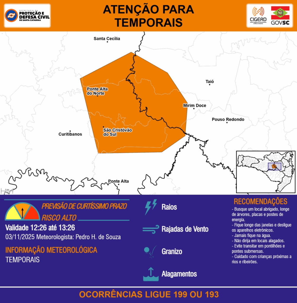ATENÇÃO – 03/11 12:26 – TEMPORAIS com RAIOS, RAJADAS DE VENTO, GRANIZO e ALAGAMENTOS para os municípios de Curitibanos, Mirim Doce, Ponte Alta, Ponte Alta do Norte, Pouso Redondo, Santa Cecília, São Cristóvão do Sul e Taió na próxima hora. Ocorrências ligue 199 ou 193.