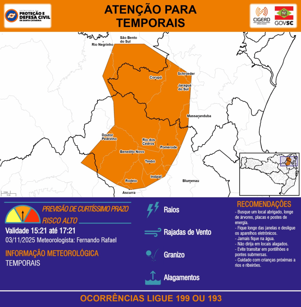 ATENÇÃO – 03/11 15:21 – TEMPORAIS com RAIOS, RAJADAS DE VENTO, GRANIZO e ALAGAMENTOS para os municípios de Ascurra, Benedito Novo, Blumenau, Corupá, Doutor Pedrinho, Indaial, Jaraguá do Sul, Massaranduba, Pomerode, Rio Negrinho, Rio dos Cedros, Rodeio, Schroeder, São Bento do Sul e Timbó nas próximas 2 horas. Ocorrências ligue 199 ou 193.