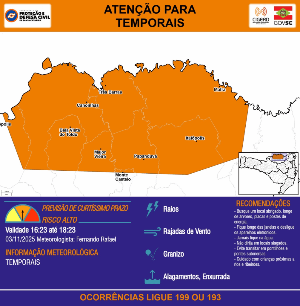 ATENÇÃO – 03/11 16:23 – TEMPORAIS com RAIOS, RAJADAS DE VENTO, GRANIZO, ALAGAMENTOS e risco de ENXURRADA para os municípios de Bela Vista do Toldo, Canoinhas, Irineópolis, Itaiópolis, Mafra, Major Vieira, Monte Castelo, Papanduva e Três Barras nas próximas 2 horas. Ocorrências ligue 199 ou 193.