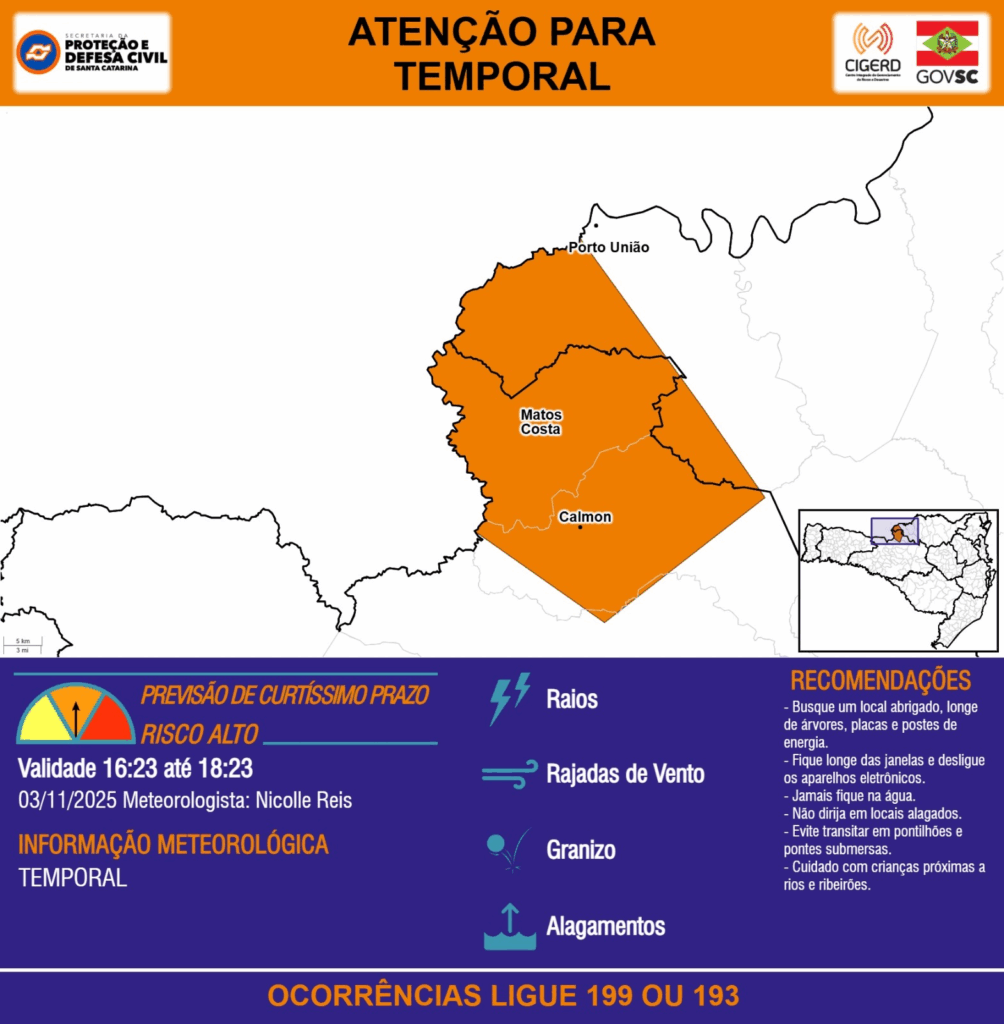 ATENÇÃO – 03/11 16:23 – TEMPORAL com RAIOS, RAJADAS DE VENTO, GRANIZO e ALAGAMENTOS para os municípios de Calmon, Caçador, Matos Costa e Porto União nas próximas 2 horas. Ocorrências ligue 199 ou 193.