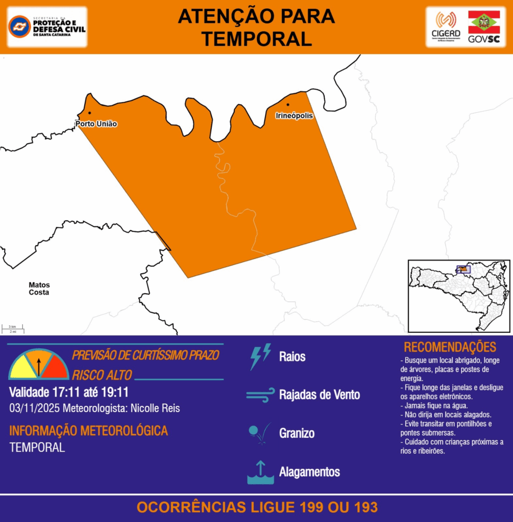 ATENÇÃO – 03/11 17:11 – TEMPORAL com RAIOS, RAJADAS DE VENTO, GRANIZO e ALAGAMENTOS para os municípios de Irineópolis, Matos Costa e Porto União nas próximas 2 horas. Ocorrências ligue 199 ou 193.