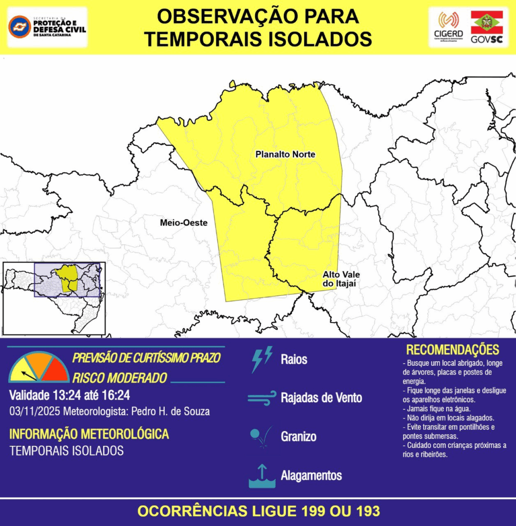 OBSERVAÇÃO – 03/11 13:24 – TEMPORAIS ISOLADOS com RAIOS, RAJADAS DE VENTO, GRANIZO e ALAGAMENTOS pontuais para as regiões do Meio-Oeste, Planalto Norte, Planalto Sul e Alto Vale do Itajaí nas próximas 3 horas. Ocorrências ligue 199 ou 193.