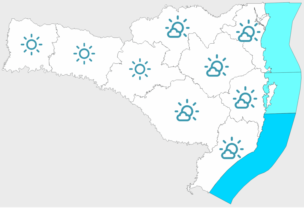 Na terça-feira (04), a instabilidade se afasta para o mar e a chuva dá uma trégua em SC. O sol aparece entre nuvens em todas as regiões, o que favorece a elevação das temperaturas. No amanhecer, as mínimas oscilam entre 12°C nas regiões mais altas do estado e 20°C no litoral. À tarde, as temperaturas máximas superam os 28°C em todas as regiões, chegando a 31°C no Extremo Oeste e Oeste. Vento de nordeste a noroeste, com intensidade fraca a moderada. Não há risco para ocorrências associadas às condições de tempo.