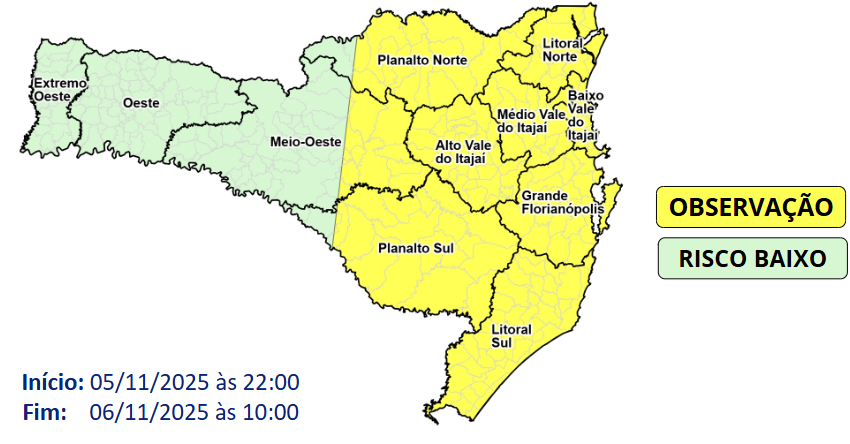 Entre esta quarta (05) e a madrugada de quinta-feira (06), o avanço de uma nova área de baixa presão em direção ao mar provoca uma mudança na direção dos ventos, que passam a predominar do quadrante sul. Essa mudança na direção dos ventos favorece um declínio acentuado nas temperaturas, especialmente na metade leste de Santa Catarina. O risco é baixo a moderado para ocorrências associadas ao desconforto térmico e agravamento de doenças cardiorrepiratórias.