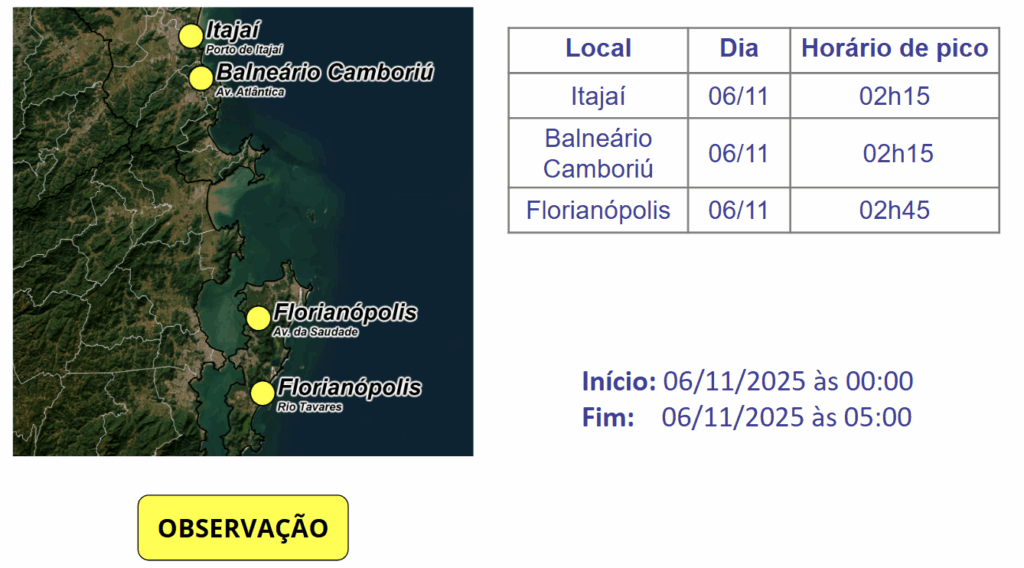 Ao longo desta quarta-feira (05), o vento sul ganha força e o mar fica agitado, conforme aviso emitido pela SDC. A combinação do mar agitado com o pico da maré, favorece as condições para alagamentos costeiros em Florianópolis, Itajaí e Balneário Camboriú, especialmente na madrugada de quinta-feira (06), conforme tabela acima. O risco é moderado para ocorrências associadas.