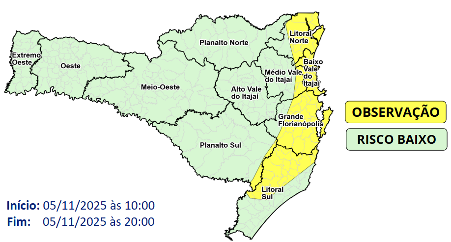 Nesta quarta-feira (05) há condições para temporais isolados e chuva intensa, principalmente nas áreas de encosta entre o Planalto Sul, Litoral Sul, Grande Florianópolis, Baixo Vale do Itajaí e Litoral Norte, devido a passagem de uma frente fria. Os temporais podem ocorrer a partir do final da manhã, nas áreas ao sul do estado, e alcançam as áreas do Litoral Norte no final da tarde.