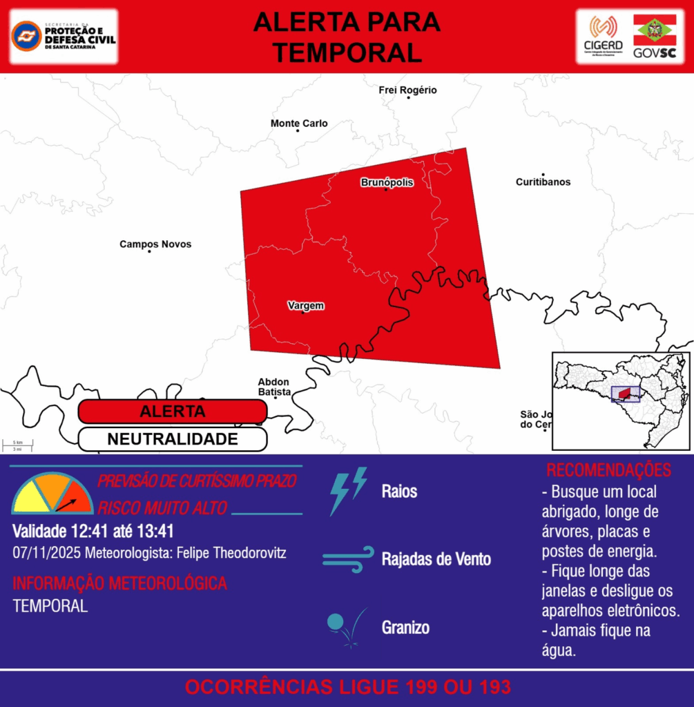 ALERTA – 07/11 12:41 – TEMPORAL com RAIOS, RAJADAS DE VENTO e GRANIZO para os municípios de Abdon Batista, Brunópolis, Campos Novos, Curitibanos, Frei Rogério, Monte Carlo, São José do Cerrito e Vargem na próxima hora. Ocorrências ligue 199 ou 193.