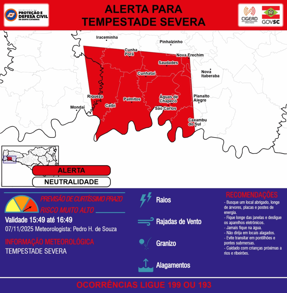 ALERTA – 07/11 15:49 – TEMPESTADE SEVERA com RAIOS, RAJADAS DE VENTO, GRANIZO e ALAGAMENTOS para os municípios de Caibi, Caxambu do Sul, Cunha Porã, Cunhataí, Iraceminha, Mondaí, Nova Erechim, Nova Itaberaba, Palmitos, Pinhalzinho, Planalto Alegre, Riqueza, Saudades, São Carlos e Águas de Chapecó na próxima hora. Ocorrências ligue 199 ou 193.