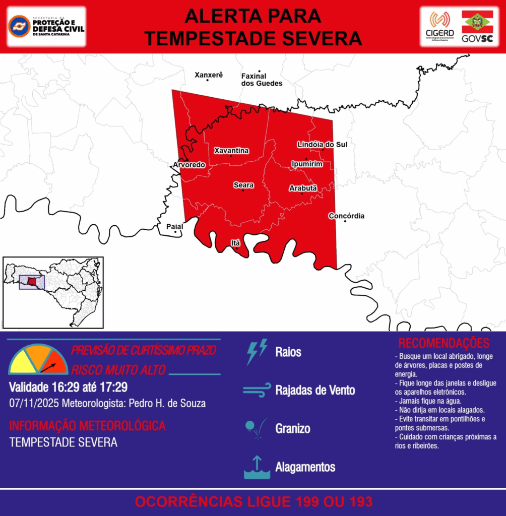 ALERTA – 07/11 16:29 – TEMPESTADE SEVERA com RAIOS, RAJADAS DE VENTO, GRANIZO e ALAGAMENTOS para os municípios de Arabutã, Arvoredo, Concórdia, Faxinal dos Guedes, Ipumirim, Itá, Lindóia do Sul, Paial, Seara, Xanxerê e Xavantina na próxima hora. Ocorrências ligue 199 ou 193.