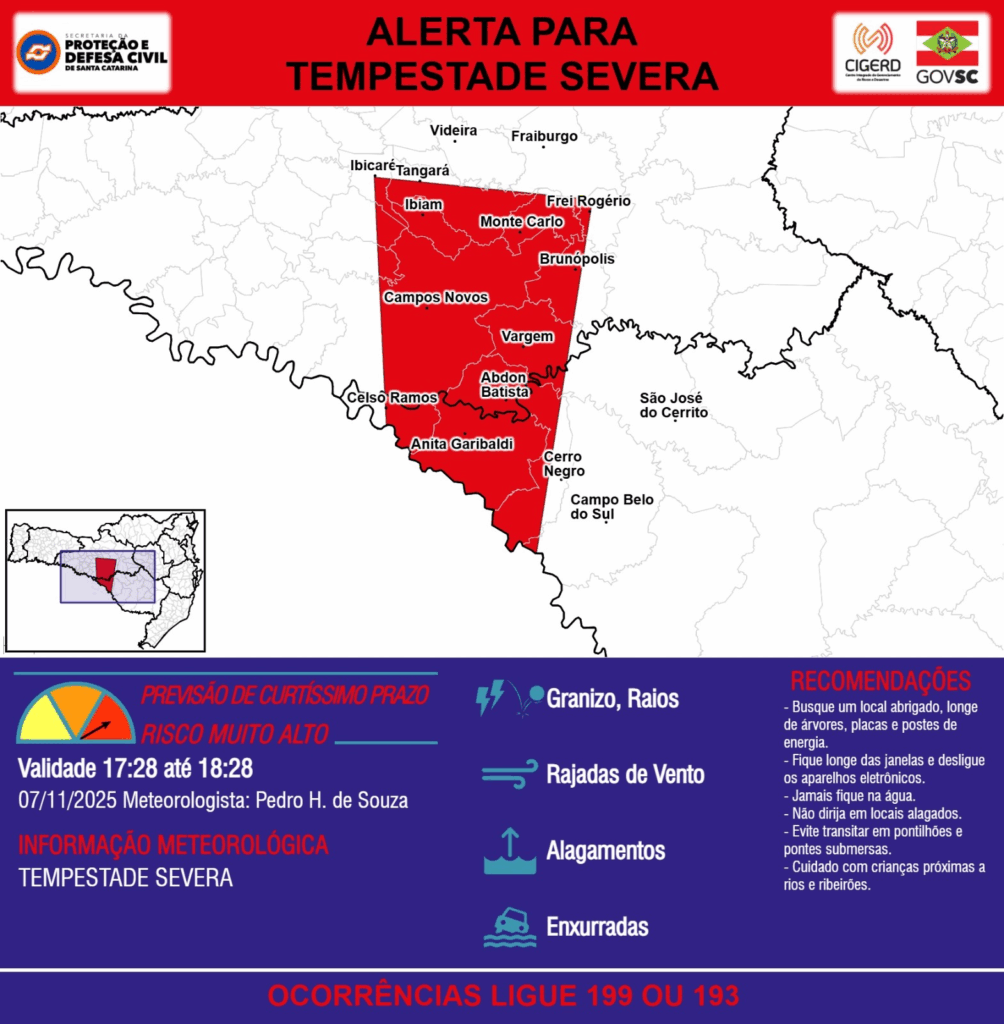 ALERTA – 07/11 17:28 – TEMPESTADE SEVERA com RAJADAS DE VENTO, ALAGAMENTOS, GRANIZO, RAIOS e risco de ENXURRADAS para as regiões do Meio-Oeste e Planalto Sul na próxima hora. Ocorrências ligue 199 ou 193.