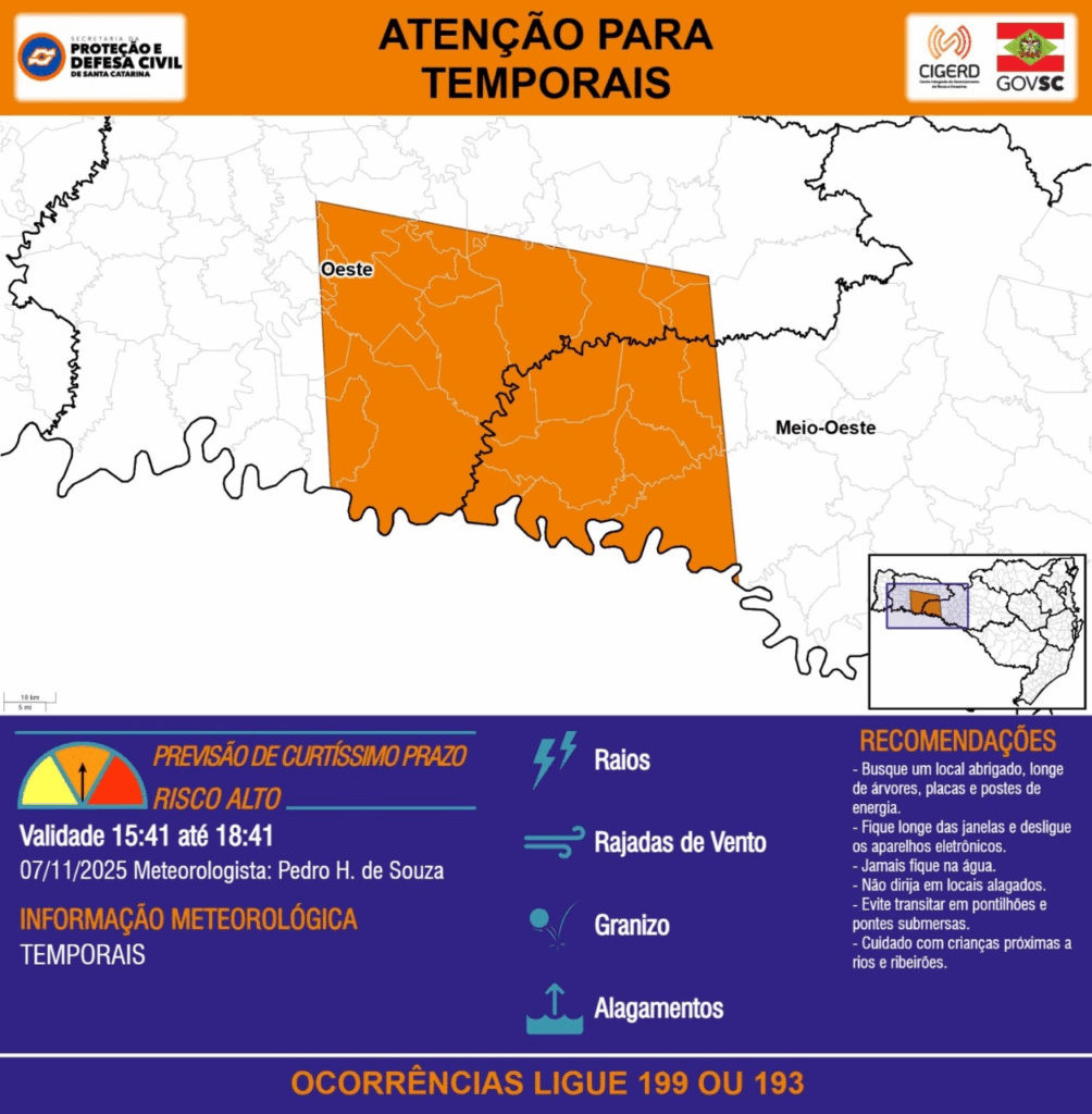 ATENÇÃO – 07/11 15:41 – TEMPORAIS com RAIOS, RAJADAS DE VENTO, GRANIZO e ALAGAMENTOS para os municípios de Arabutã, Arvoredo, Bom Jesus, Chapecó, Concórdia, Cordilheira Alta, Coronel Freitas, Entre Rios, Faxinal dos Guedes, Guatambu, Ipuaçu, Ipumirim, Itá, Jardinópolis, Lajeado Grande, Lindóia do Sul, Marema, Nova Itaberaba, Paial, Passos Maia, Ponte Serrada, Quilombo, Seara, União do Oeste, Vargeão, Xanxerê, Xavantina, Xaxim e Águas Frias nas próximas 3 horas. Ocorrências ligue 199 ou 193.