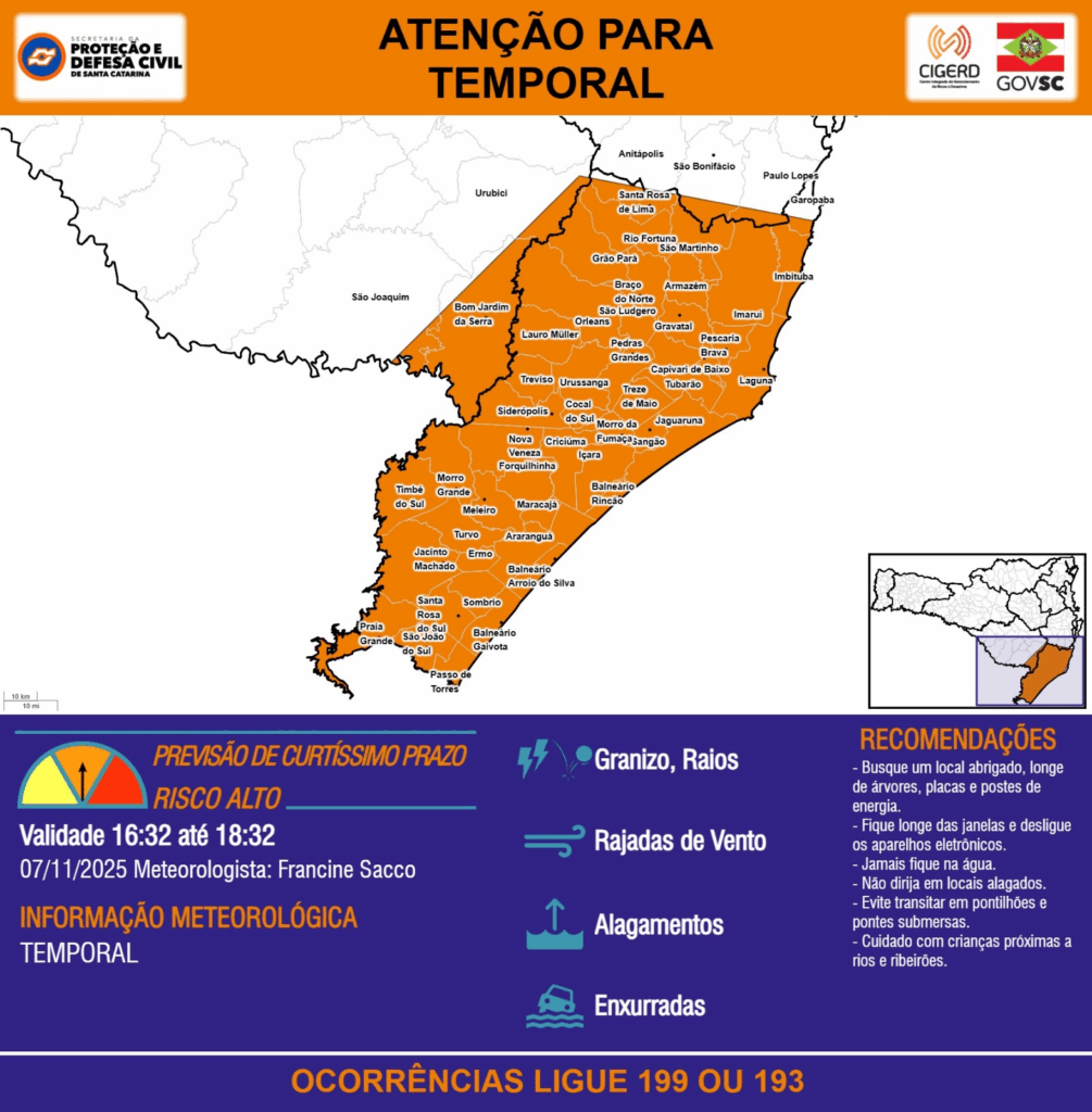 ATENÇÃO – 07/11 16:32 – TEMPORAL com RAJADAS DE VENTO, ALAGAMENTOS, GRANIZO, RAIOS e risco de ENXURRADAS para as regiões do Planalto Sul, Litoral Sul e Grande Florianópolis nas próximas 2 horas. Ocorrências ligue 199 ou 193.