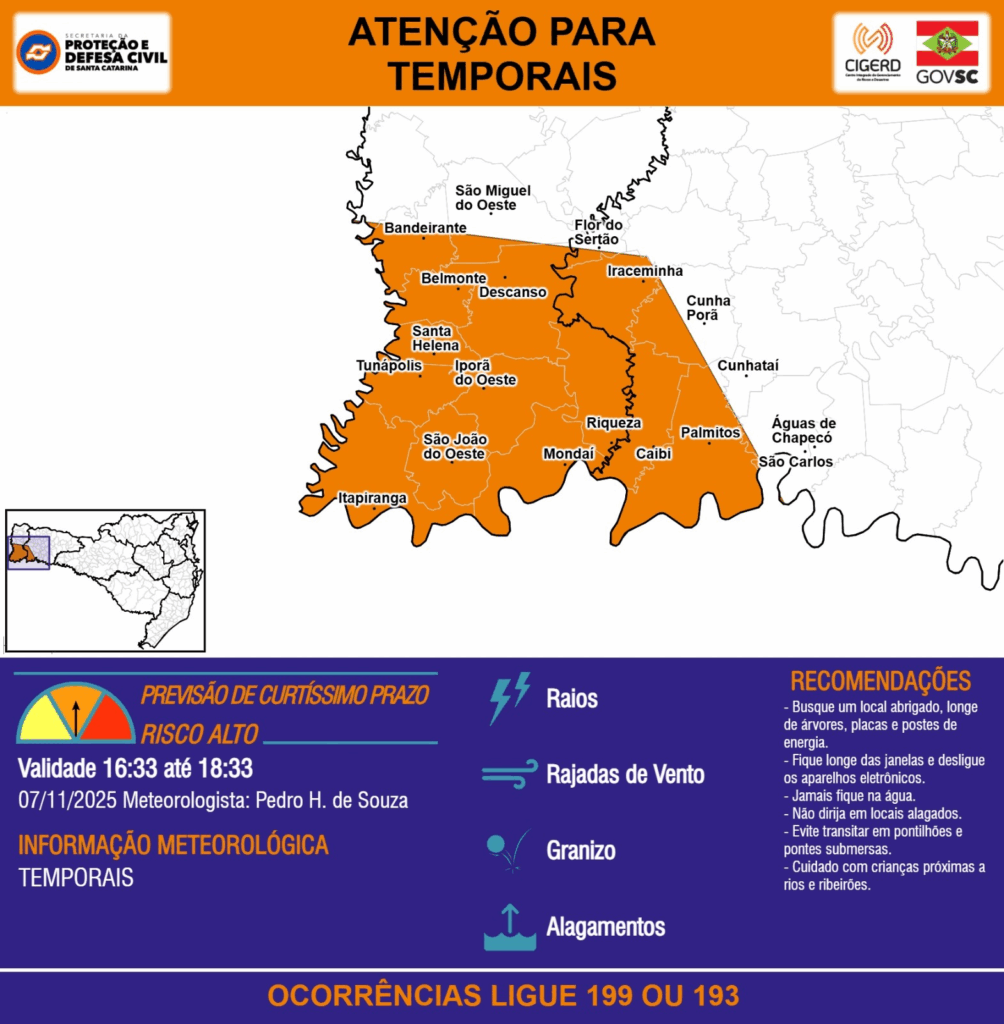 ATENÇÃO – 07/11 16:33 – TEMPORAIS com RAIOS, RAJADAS DE VENTO, GRANIZO e ALAGAMENTOS para os municípios de Bandeirante, Belmonte, Caibi, Cunha Porã, Cunhataí, Descanso, Flor do Sertão, Iporã do Oeste, Iraceminha, Itapiranga, Mondaí, Palmitos, Riqueza, Santa Helena, São Carlos, São João do Oeste, São Miguel do Oeste, Tunápolis e Águas de Chapecó nas próximas 2 horas. Ocorrências ligue 199 ou 193