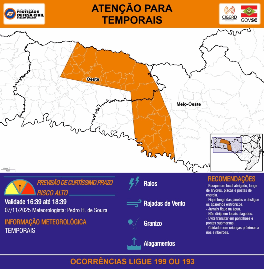 ATENÇÃO – 07/11 16:39 – TEMPORAIS com RAIOS, RAJADAS DE VENTO, GRANIZO e ALAGAMENTOS para os municípios de Abelardo Luz, Alto Bela Vista, Bom Jesus, Campos Novos, Capinzal, Catanduvas, Concórdia, Coronel Martins, Entre Rios, Faxinal dos Guedes, Formosa do Sul, Galvão, Ipira, Ipuaçu, Ipumirim, Irani, Irati, Jaborá, Jardinópolis, Joaçaba, Jupiá, Lacerdópolis, Lindóia do Sul, Marema, Novo Horizonte, Ouro, Ouro Verde, Passos Maia, Peritiba, Piratuba, Ponte Serrada, Presidente Castello Branco, Quilombo, Santiago do Sul, São Domingos, São Lourenço do Oeste, Vargem Bonita, Vargeão, Xanxerê, Zortéa e Água Doce nas próximas 2 horas. Ocorrências ligue 199 ou 193.