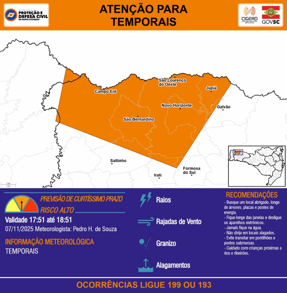 ATENÇÃO – 07/11 17:51 – TEMPORAIS com RAIOS, RAJADAS DE VENTO, GRANIZO e ALAGAMENTOS para a região do Oeste na próxima hora. Ocorrências ligue 199 ou 193.