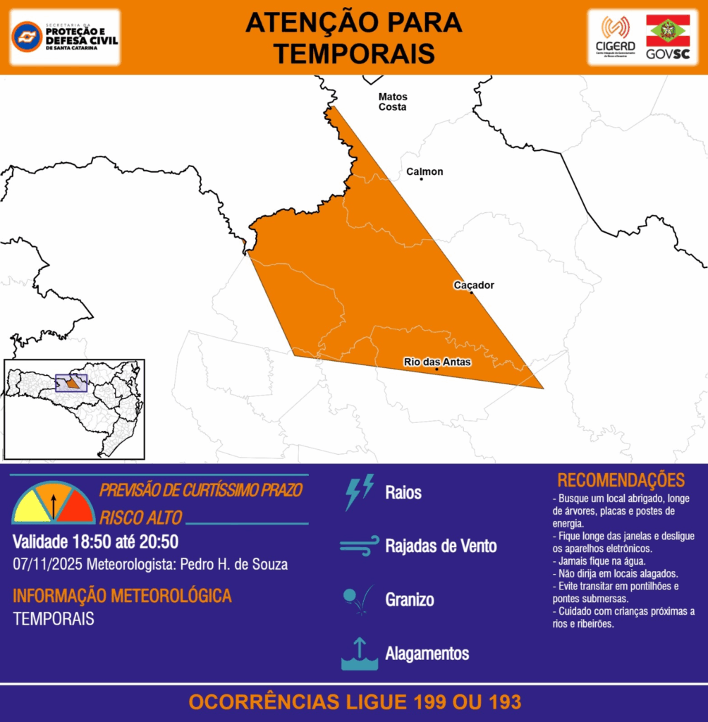 ATENÇÃO – 07/11 18:50 – TEMPORAIS com RAIOS, RAJADAS DE VENTO, GRANIZO e ALAGAMENTOS para os municípios de Calmon, Caçador, Matos Costa e Rio das Antas nas próximas 2 horas. Ocorrências ligue 199 ou 193