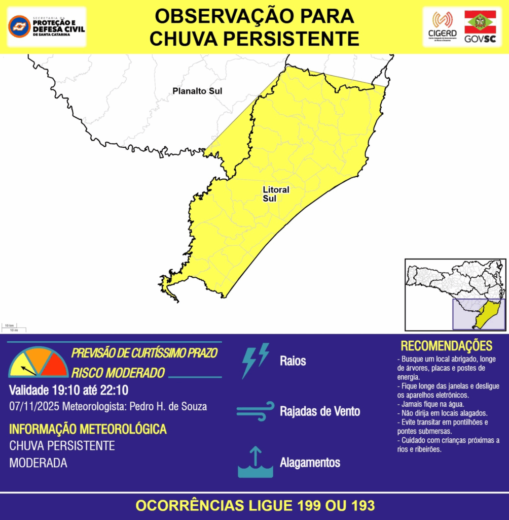 OBSERVAÇÃO – 07/11 19:10 – CHUVA PERSISTENTE de intensidade moderada com RAIOS, RAJADAS DE VENTO e ALAGAMENTOS pontuais para as regiões do Planalto Sul e Litoral Sul nas próximas 3 horas. Ocorrências ligue 199 ou 193.