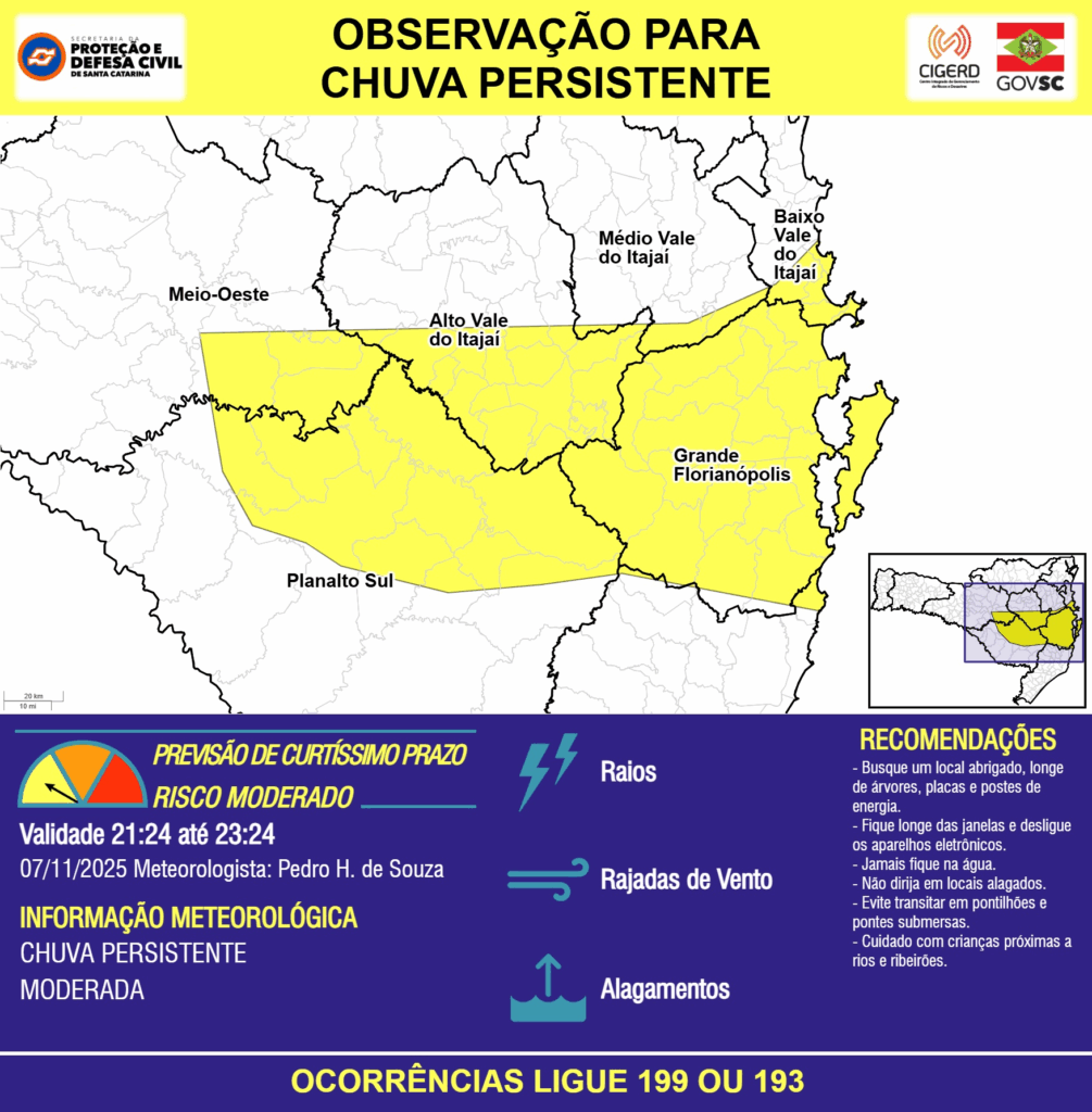 OBSERVAÇÃO – 07/11 21:24 – CHUVA PERSISTENTE de intensidade moderada com RAIOS, RAJADAS DE VENTO e ALAGAMENTOS pontuais para as regiões do Meio-Oeste, Planalto Sul, Litoral Sul, Grande Florianópolis, Baixo, Médio e Alto Vale do Itajaí nas próximas 2 horas. Ocorrências ligue 199 ou 193.