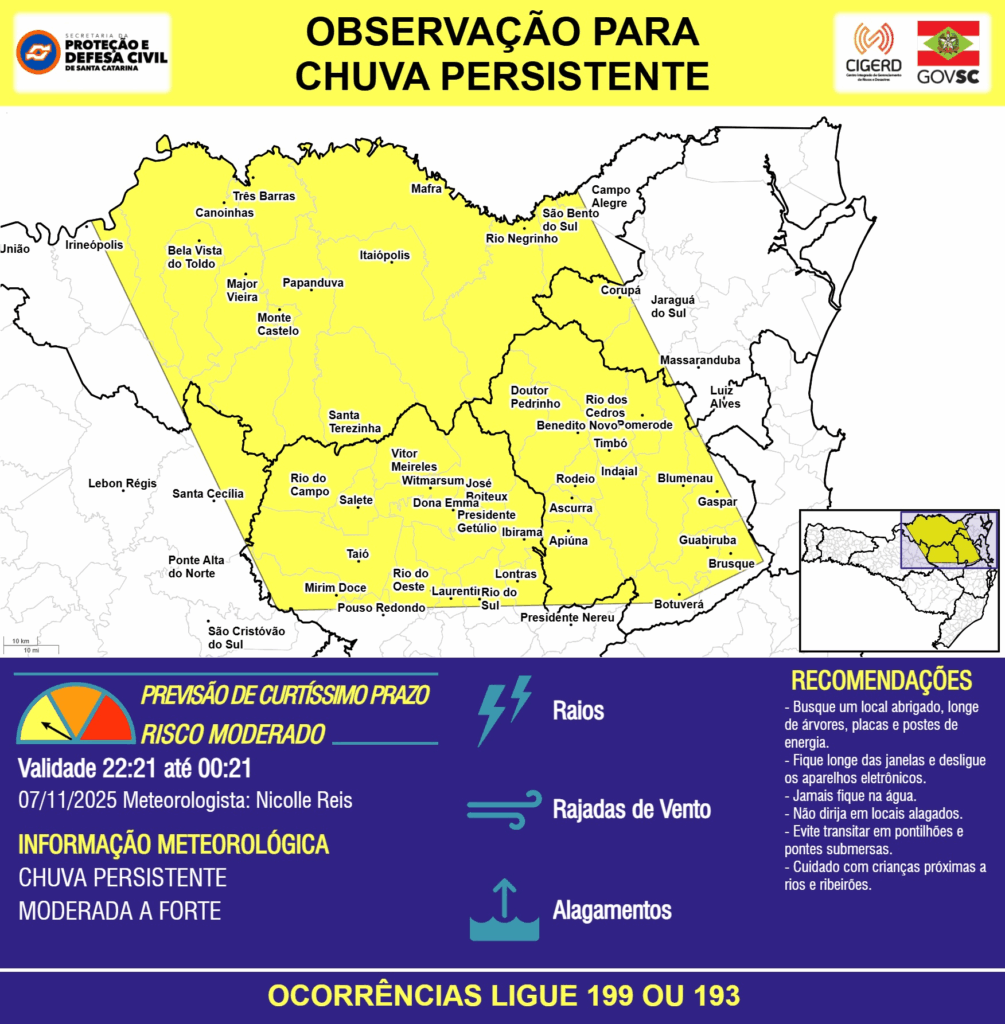 A Secretaria da Proteção e Defesa Civil segue monitorando as condições meteorológicas. Esteja preparado para tomar as ações necessárias em caso de agravamento da situação.