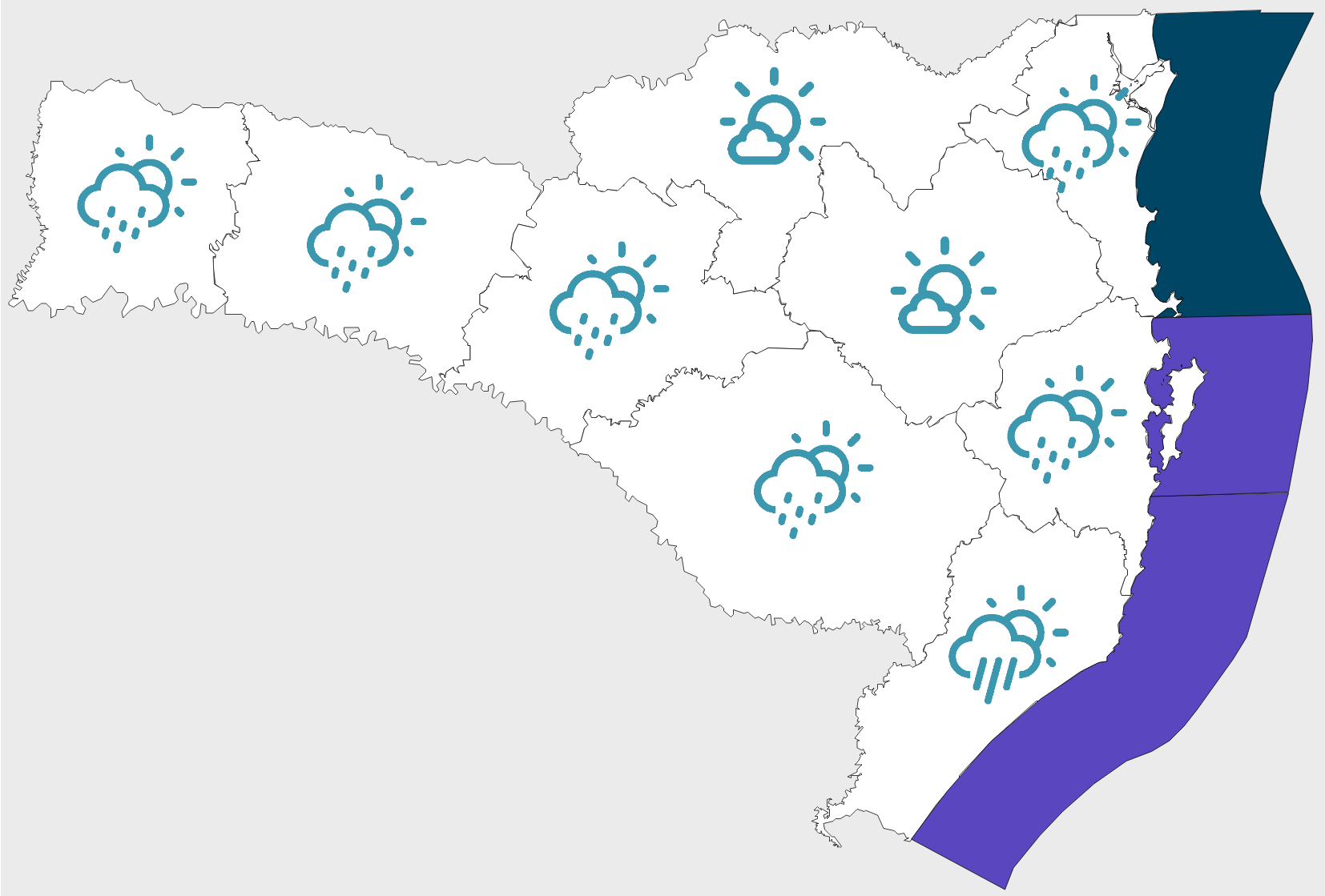 No sábado (08), o Ciclone Extratropical já formado próximo da costa de SC se afasta gradativamente ao longo do dia para o alto mar. A sua influência manterá o dia com maior nebulosidade e condições para pancadas de chuva, especialmente entre o Grande Oeste, Planalto Sul, Litoral Sul e Grd. Florianópolis. No Litoral Sul, a chuva ainda pode ser pontualmente intensa, com risco baixo a moderado para ocorrências associadas. Os ventos associados ao sistema devem apresentar forte intensidade entre o Meio-Oeste e o Litoral com rajadas entre 70 e 90 km/h, especialmente nas áreas costeiras e serranas onde podem ficar próximas dos 100 km/h, oferecendo risco alto a muito alto para ocorrências associadas a destelhamentos, danos na rede elétrica e queda de galhos e árvores nessas regiões. Essa condição também favorece ressaca, agitação marítima e mar muito agitado/grosso com ondas entre 3m e 4m de altura com picos maiores em alto mar, oferecendo risco alto a muito alto para ocorrências associadas à agitação marítima.