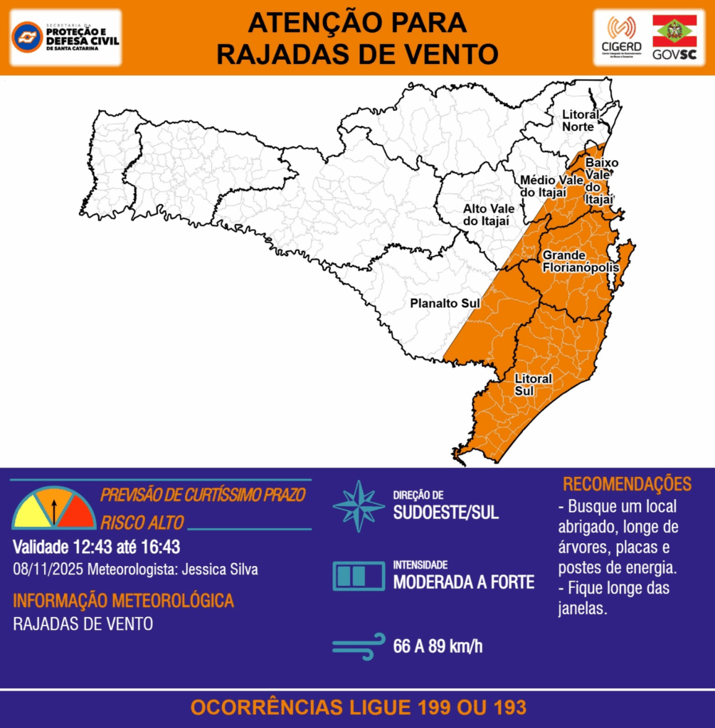 ATENÇÃO – 08/11 12:43 – RAJADAS DE VENTO de quadrante sudoeste/sul, com intensidade MODERADA A FORTE (66 a 89 km/h), para as regiões do Litoral Norte, Planalto Sul, Litoral Sul, Grande Florianópolis, Baixo, Médio e Alto Vale do Itajaí nas próximas 4 horas. Ocorrências ligue 199 ou 193.