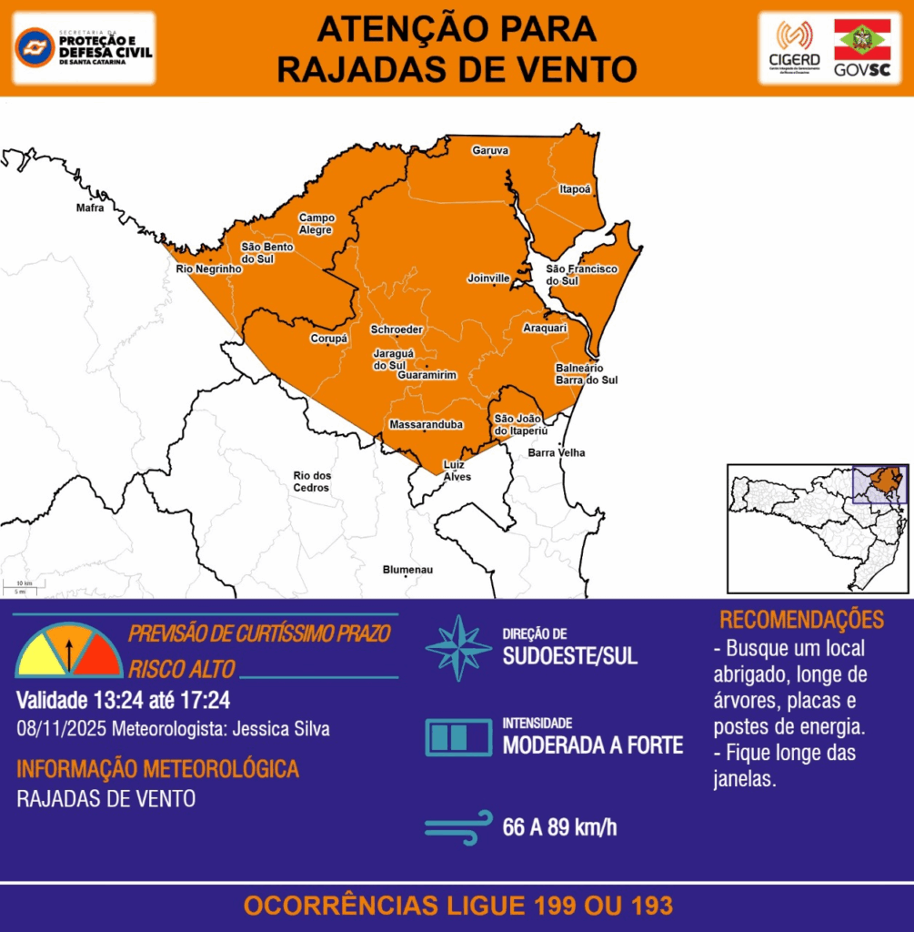 ATENÇÃO – 08/11 13:24 – RAJADAS DE VENTO de quadrante sudoeste/sul, com intensidade MODERADA A FORTE (66 a 89 km/h), para as regiões do Planalto Norte, Litoral Norte, Baixo e Médio Vale do Itajaí nas próximas 4 horas. Ocorrências ligue 199 ou 193.
