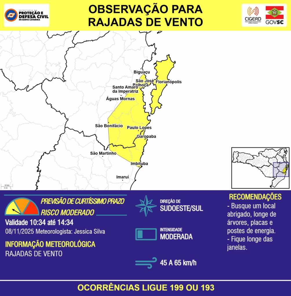 OBSERVAÇÃO – 08/11 10:34 – RAJADAS DE VENTO de quadrante sudoeste/sul, com intensidade MODERADA (45 a 65 km/h), para as regiões do Litoral Sul e Grande Florianópolis nas próximas 4 horas. Ocorrências ligue 199 ou 193.