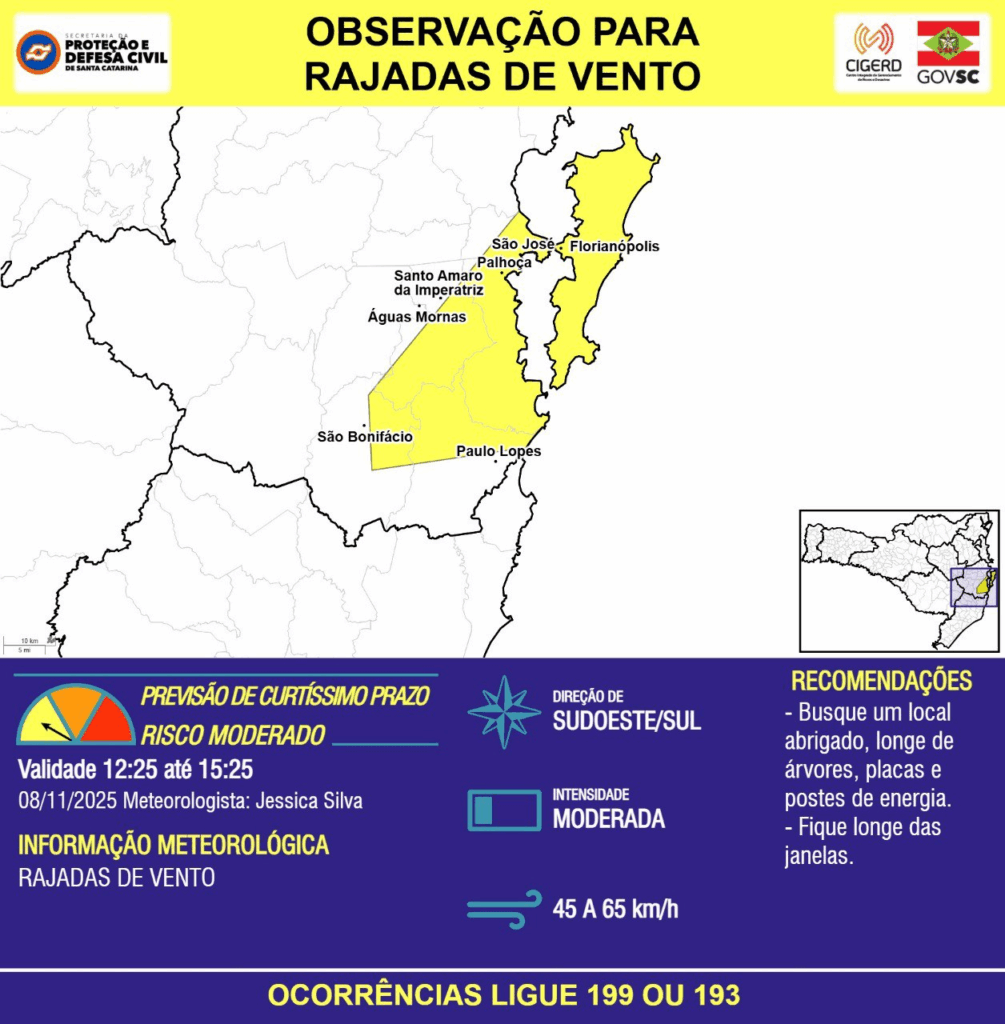 OBSERVAÇÃO – 08/11 12:25 – RAJADAS DE VENTO de quadrante sudoeste/sul, com intensidade MODERADA (45 a 65 km/h), para a região da Grande Florianópolis nas próximas 3 horas. Ocorrências ligue 199 ou 193.