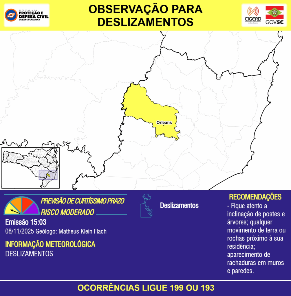 OBSERVAÇÃO – 08/11 15:03 – DESLIZAMENTOS para o município de Orleans. Ocorrências ligue 199 ou 193.