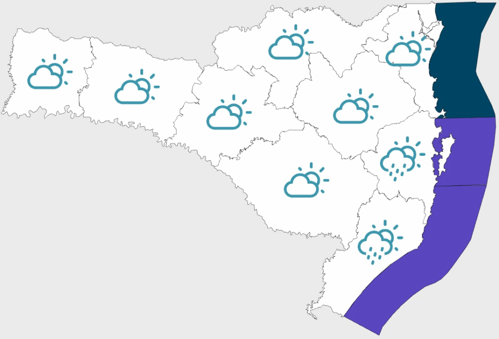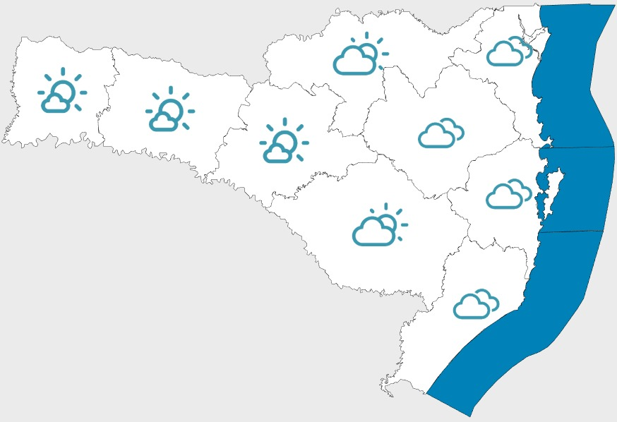 Na segunda-feira (10), a alta pressão ainda mantém o tempo estável sobre o estado catarinense e com o tempo semelhante ao dia anterior. Os ventos na maior parte do dia no Litoral Sul serão predominantes de sudeste, já nas regiões de Grande Florianópolis, Baixo Vale do Itajaí e Litoral Norte os ventos serão predominante leste, porém com menor cobertura de nuvens em relação ao dia anterior. Durante o dia, no Centro e Grande Oeste os ventos variam entre leste e sudeste com fraca intensidade. As temperaturas permanecem amenas pela manhã, com mínimas de 10 a 15°C na maiorias das áreas, mas voltam a subir à tarde. No Grande Oeste os termômetros chegam aos 27°C e na metade leste ficam em torno de 23°C. Sem riscos para ocorrências meteorológicas. A agitação marítima diminui e não há mais risco associado.