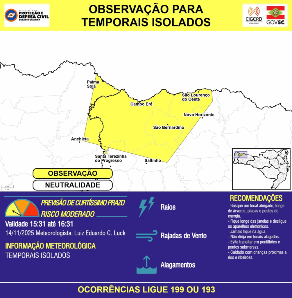 OBSERVAÇÃO – 14/11 15:31 – TEMPORAIS ISOLADOS com RAIOS, RAJADAS DE VENTO e ALAGAMENTOS pontuais para as regiões do Extremo Oeste e Oeste na próxima hora. Ocorrências ligue 199 ou 193.