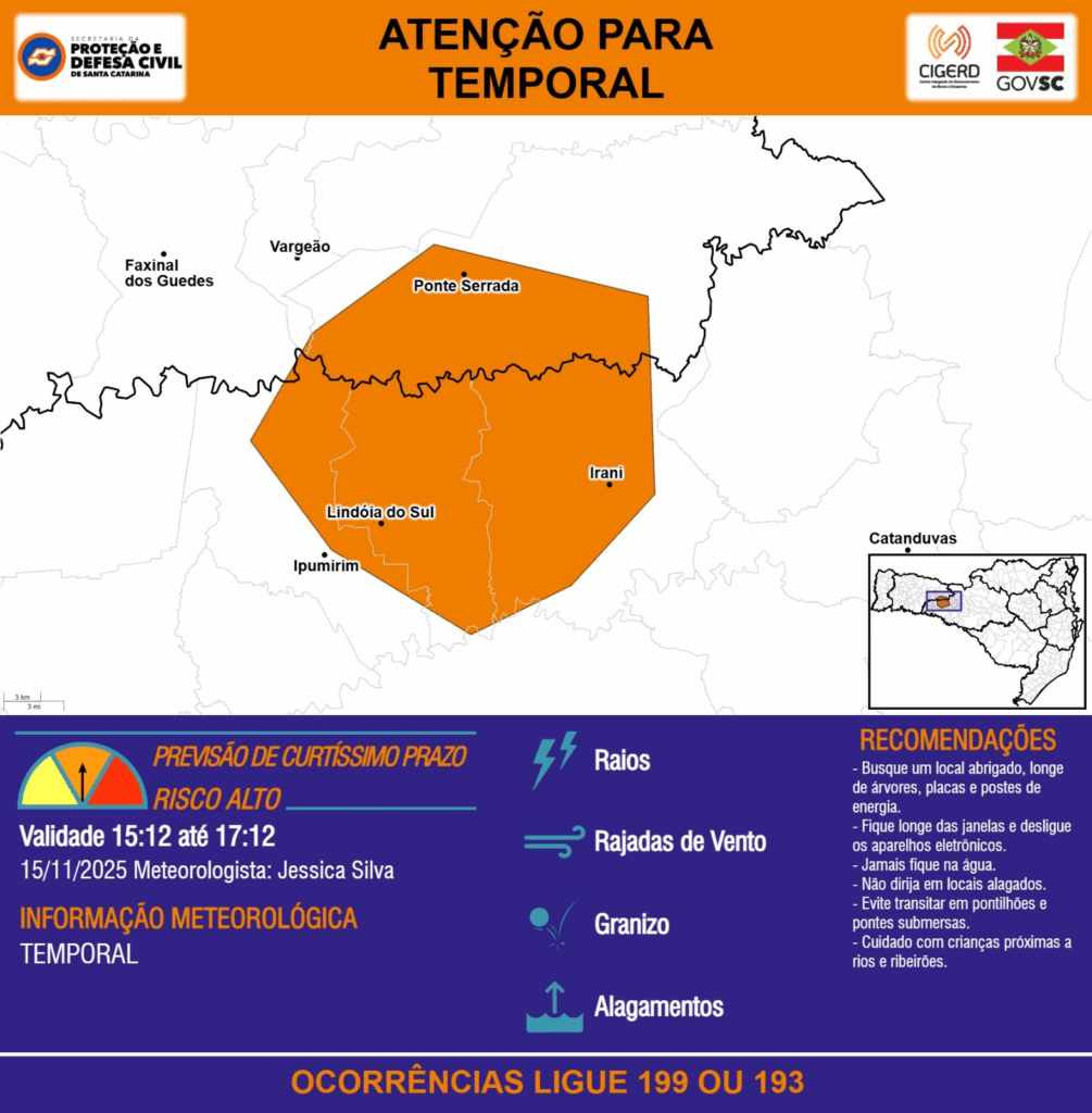 ATENÇÃO – 15/11 15:12 – TEMPORAL com RAIOS, RAJADAS DE VENTO, GRANIZO e ALAGAMENTOS para os municípios de Catanduvas, Concórdia, Faxinal dos Guedes, Ipumirim, Irani, Lindóia do Sul, Ponte Serrada e Vargeão nas próximas 2 horas. Ocorrências ligue 199 ou 193.