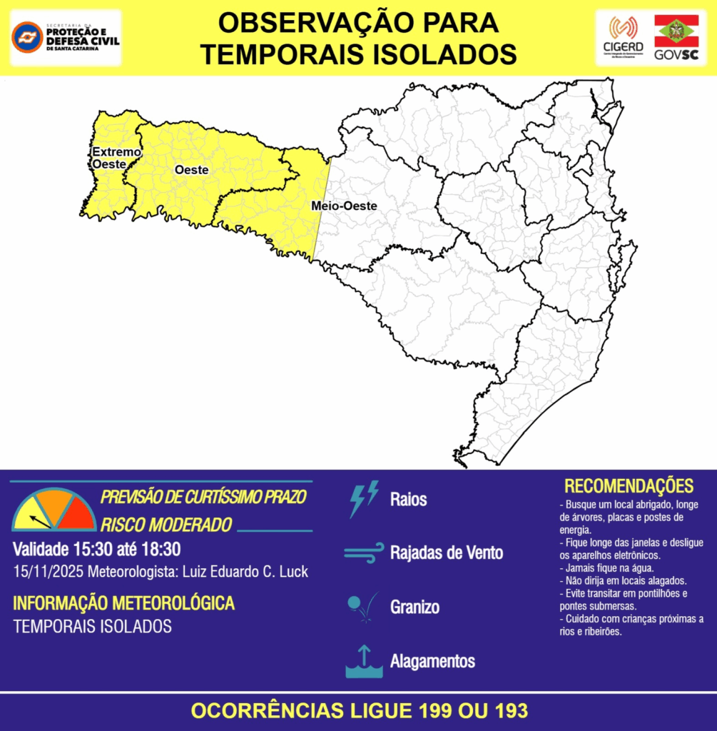 OBSERVAÇÃO – 15/11 15:30 – TEMPORAIS ISOLADOS com RAIOS, RAJADAS DE VENTO, GRANIZO e ALAGAMENTOS pontuais para as regiões do Extremo Oeste, Oeste e Meio-Oeste nas próximas 3 horas. Ocorrências ligue 199 ou 193.
