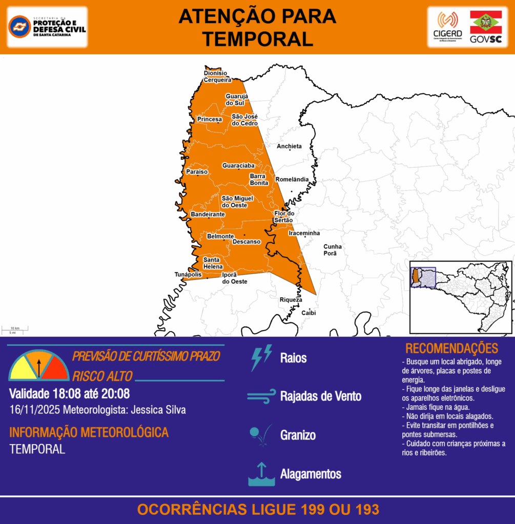ATENÇÃO – 16/11 18:08 – TEMPORAL com RAIOS, RAJADAS DE VENTO, GRANIZO e ALAGAMENTOS para os municípios de Anchieta, Bandeirante, Barra Bonita, Belmonte, Caibi, Cunha Porã, Descanso, Dionísio Cerqueira, Flor do Sertão, Guaraciaba, Guarujá do Sul, Iporã do Oeste, Iraceminha, Paraíso, Princesa, Riqueza, Romelândia, Santa Helena, São José do Cedro, São Miguel do Oeste e Tunápolis nas próximas 2 horas. Ocorrências ligue 199 ou 193.