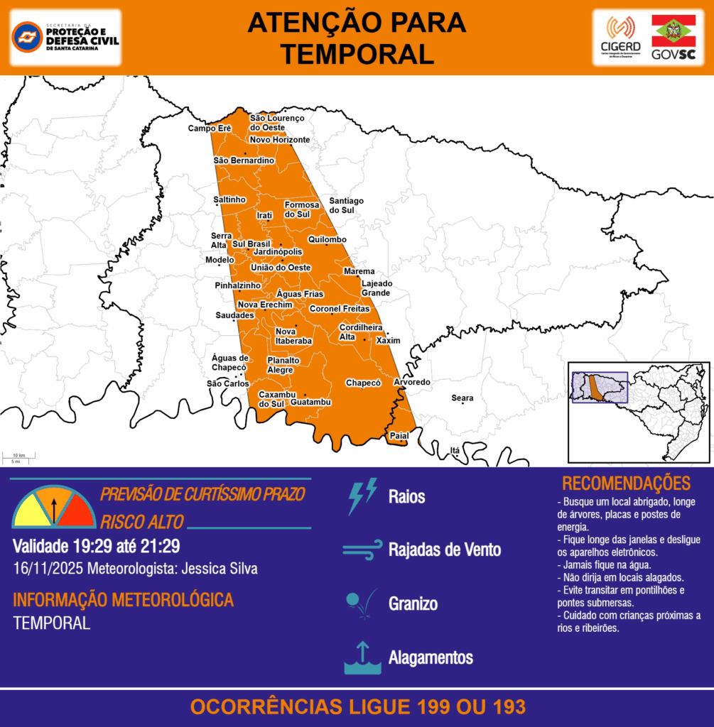 ATENÇÃO – 16/11 19:29 – TEMPORAL com RAIOS, RAJADAS DE VENTO, GRANIZO e ALAGAMENTOS para as regiões do Oeste e Meio-Oeste nas próximas 2 horas. Ocorrências ligue 199 ou 193.