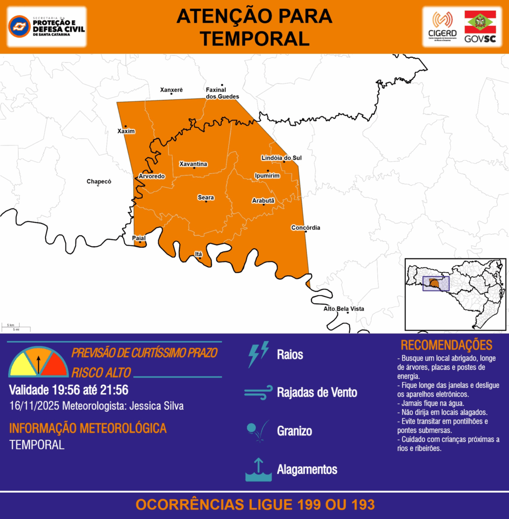 ATENÇÃO – 16/11 19:56 – TEMPORAL com RAIOS, RAJADAS DE VENTO, GRANIZO e ALAGAMENTOS para os municípios de Alto Bela Vista, Arabutã, Arvoredo, Chapecó, Concórdia, Faxinal dos Guedes, Ipumirim, Itá, Lindóia do Sul, Paial, Seara, Xanxerê, Xavantina e Xaxim nas próximas 2 horas. Ocorrências ligue 199 ou 193.